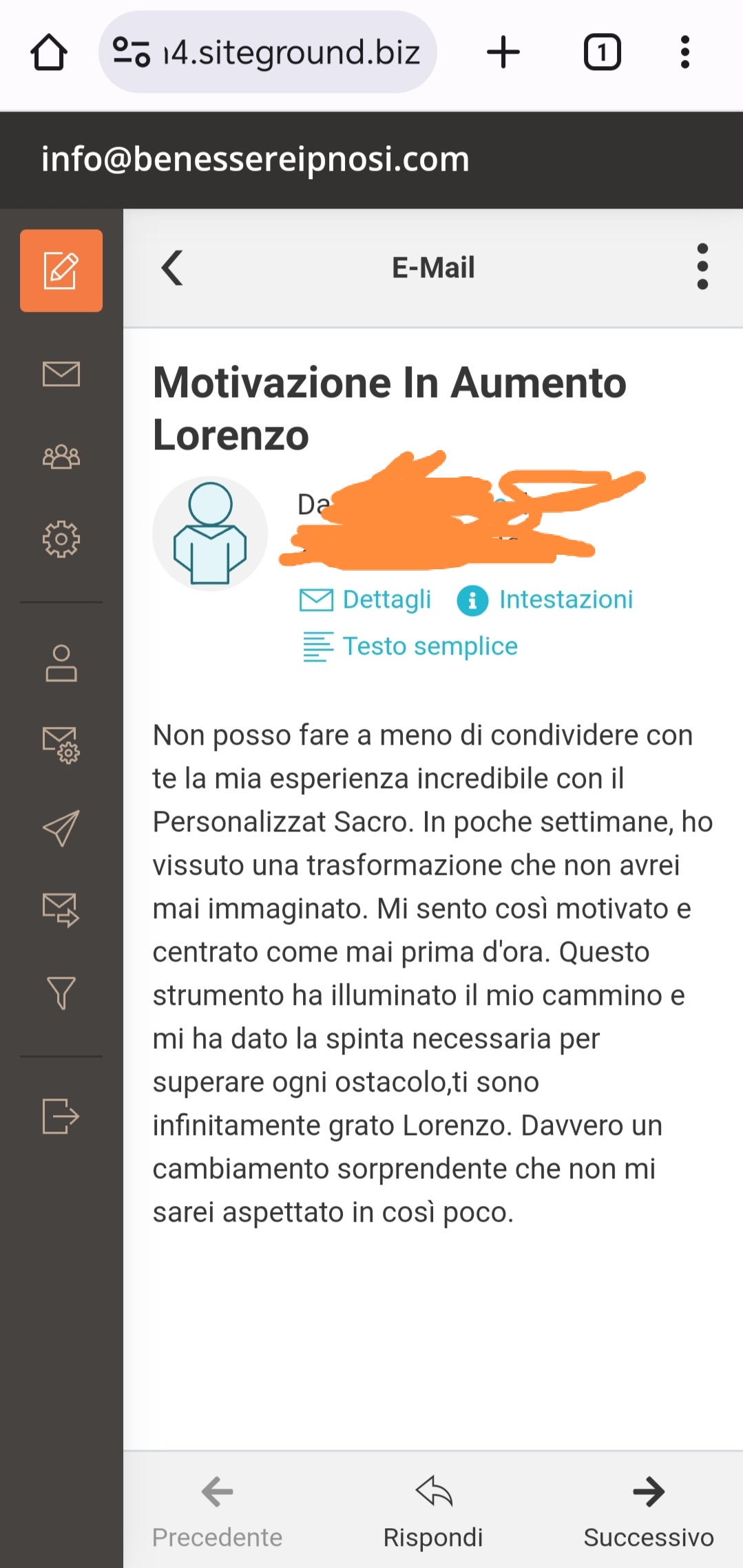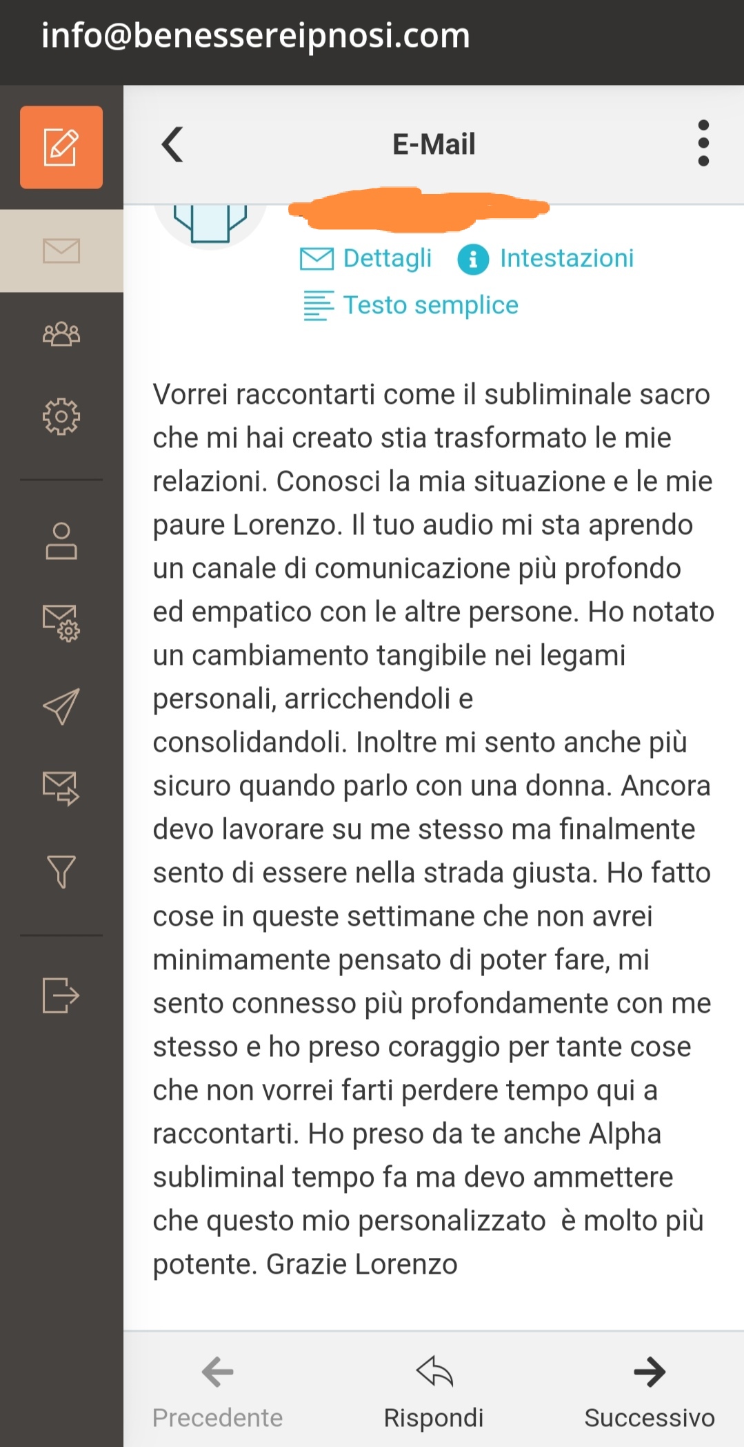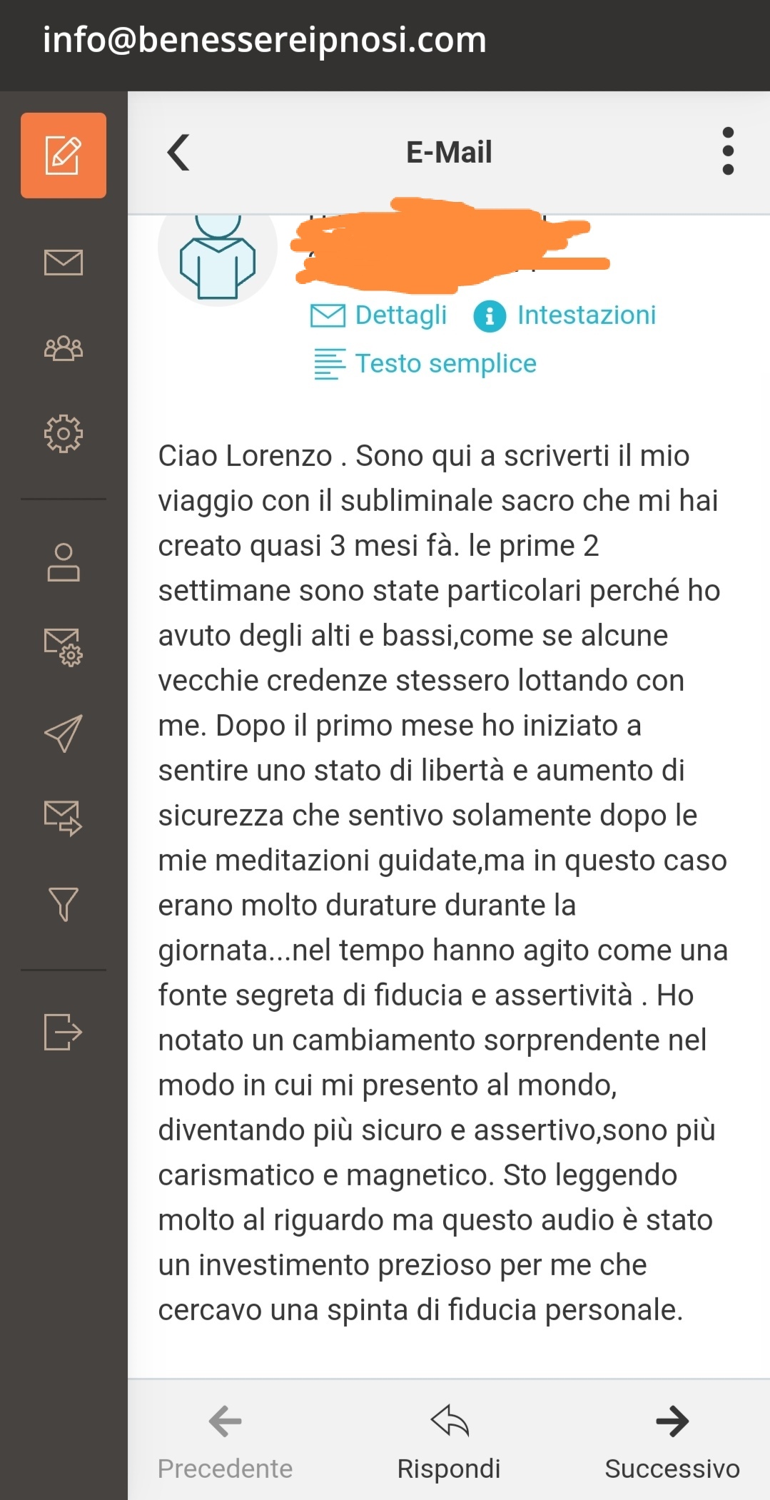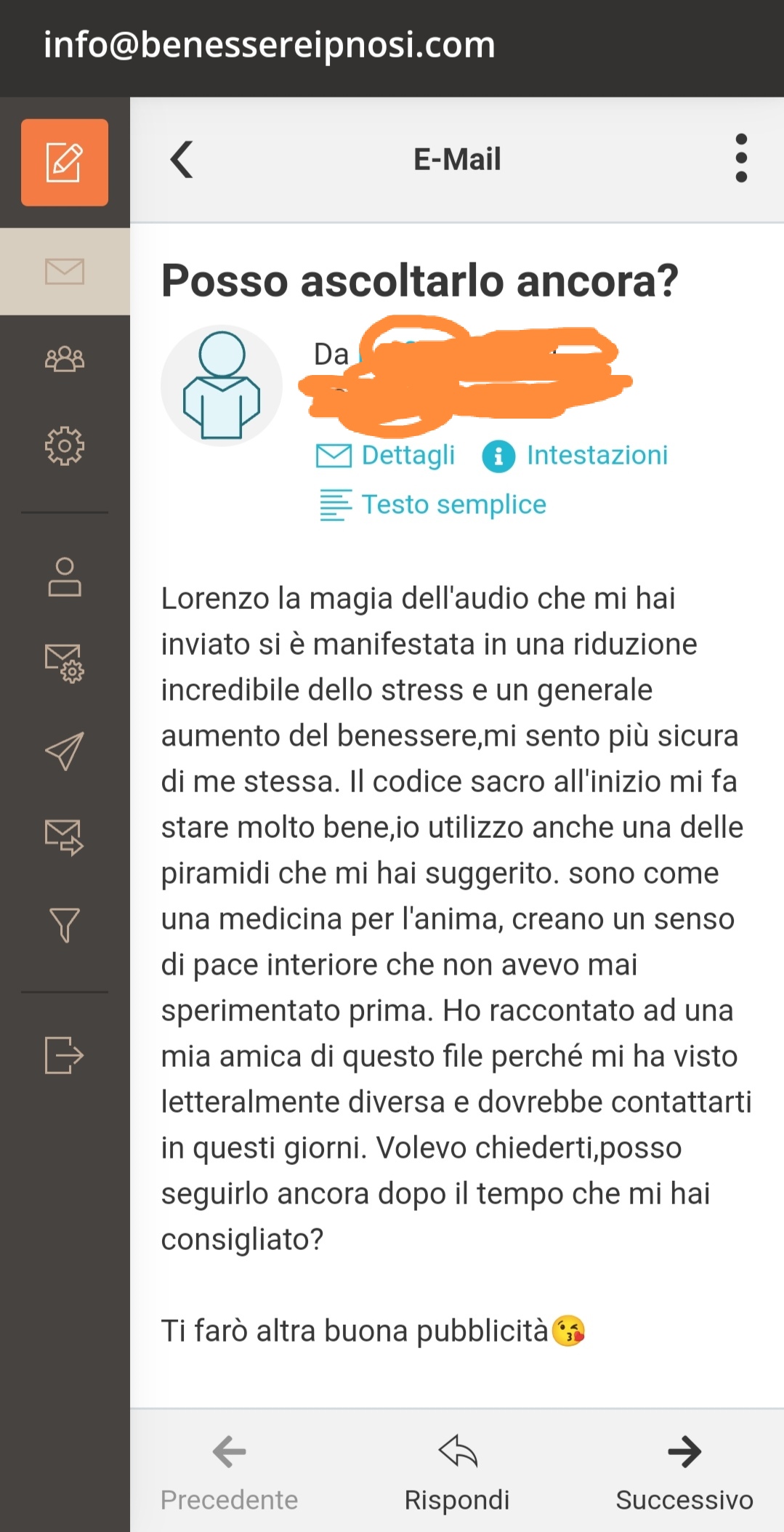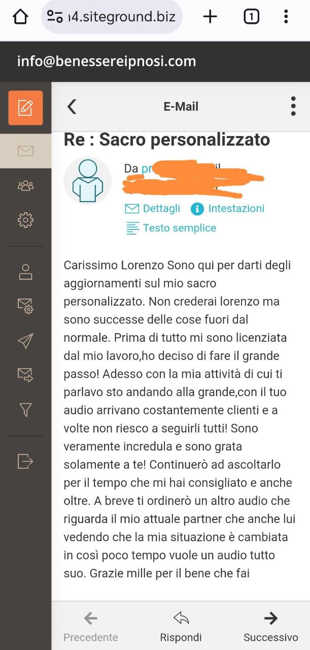 Inoltre, il tuo audio personalizzato sarà facilmente accessibile, consentendoti di scaricarlo direttamente sul tuo cellulare e ascoltarlo anche offline. Investi in te stesso oggi e scopri il potenziale trasformativo di Subliminale Sacro Personalizzato. Siamo pronti a guidarti verso una versione migliore di te stesso. Clicca qui sotto per inviare immediatamente la tua richiesta tramite e-mail in totale Privacy.