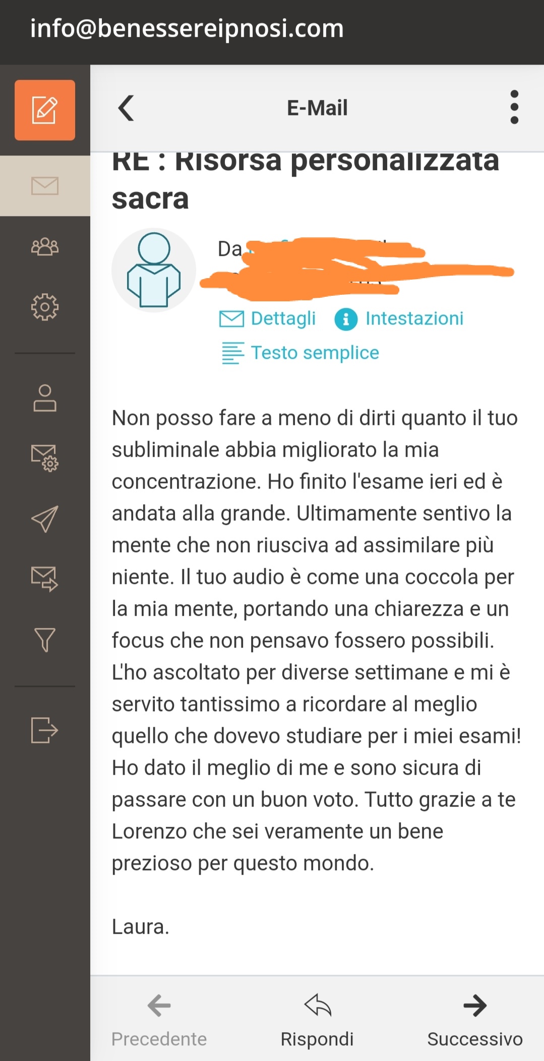 Attraverso domande dettagliate, ho acquisito una comprensione approfondita della situazione di Michele. Per rispondere alle sue esigenze, ho creato un Subliminale Sacro Personalizzato per Michele, incorporando un particolare codice sacro, suggestioni mirate non solo alla sua situazione accademica, ma anche affrontando il problema dell'insonnia che recentemente lo affliggeva. Inoltre, ho incluso frequenze profonde progettate per portare la sua mente in uno stato Delta, garantendo un totale rilassamento.
