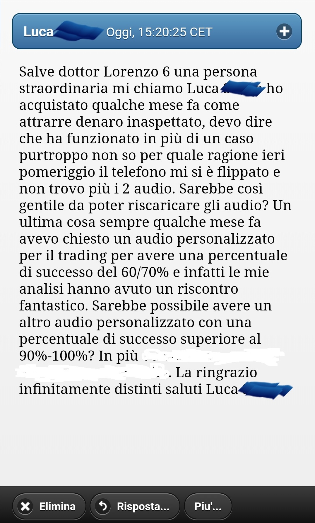 Giulio, da anni nel mondo del trading, ha rivolto la sua attenzione a me per beneficiare di un Subliminale Sacro Personalizzato, con l'obiettivo di affrontare le sfide ricorrenti nel suo business. Da anni, Giulio si trova in un'oscillante situazione finanziaria, subendo perdite consistenti. Una delle principali difficoltà che affronta è la gestione delle componenti emotive e psicologiche connesse al trading.