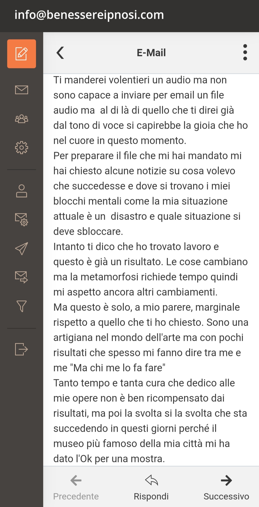 Dopo una valutazione attenta e una serie di domande mirate, ho rassicurato Elena sulla possibilità di creare un file adatto alle sue esigenze. Elena, legittimamente, ha esposto una preoccupazione riguardo all'influenza su libero arbitrio di Luca (nome fittizio per preservare la privacy). Ho spiegato con chiarezza che gli audio prodotti mirano a lavorare per il bene di entrambe le parti coinvolte, influenzando energie universali positive per manifestare eventi e situazioni utili a riconquistare il suo amore.